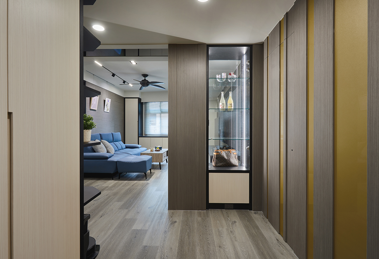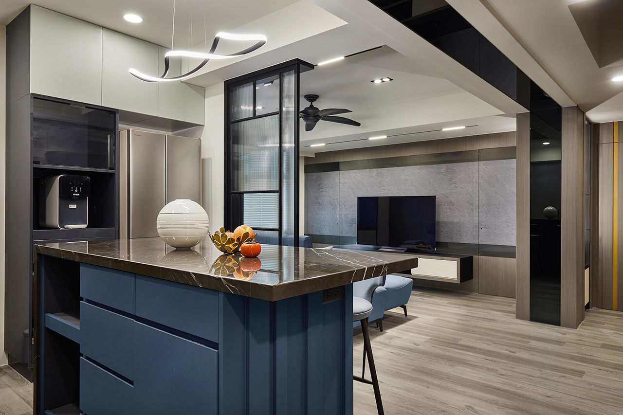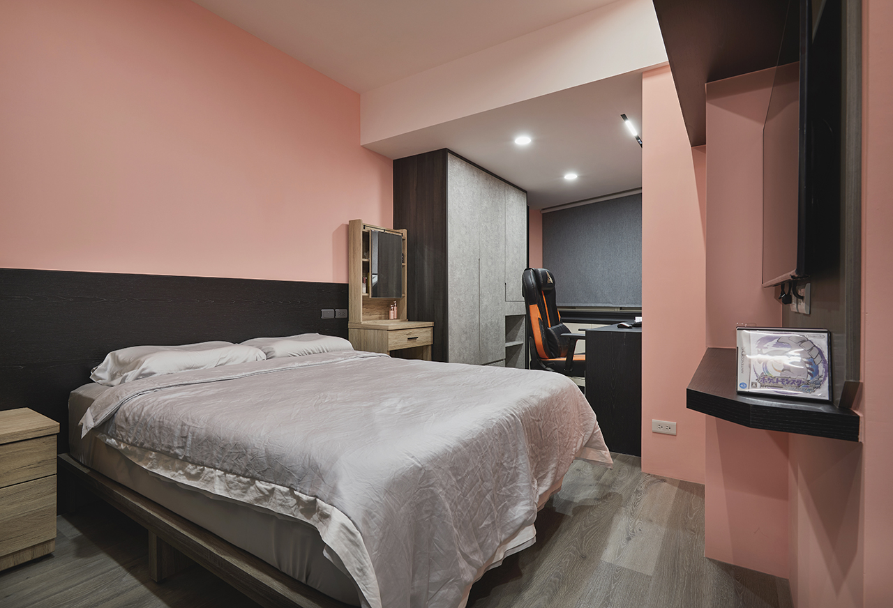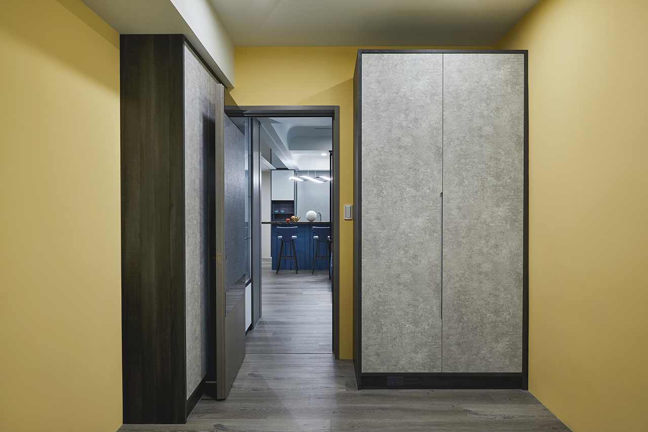 配色方面,登豐設計擴大色塊面積,由此強化每個場域的主題性,例如廚房的靛藍色、臥室的嬌嫩粉與野麥黃、客廳的木質灰等,並在端景處安排鮮明亮眼的金黃色,透過鬆弛有度的色塊運用,登豐設計能夠快速建立視覺關係,細緻的解構空間概念並連結一家人的情感。