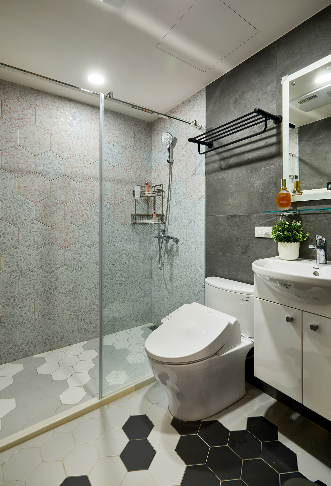 以先天條件來看,其實基地外觀並不算工整,多處呈現幾何斜邊,導致客廳臨窗處、客房及主臥都有著傾斜之感,加上屋內有一根大梁橫貫,視線上頗有負擔,所以登豐設計在重新調配空間時略有挑戰,且有鑑於原始天花與樓板高度相對有限,為了營造挑高感受,於是藉由使用玻璃材料、鏡面反射與巧妙調配色彩,勾勒出驚人的視覺效果,有效去除梁柱過於礙眼的困擾,同時考量屋齡較具歷史,因此額外花費時間來補強結構,進一步保障居住安全性。